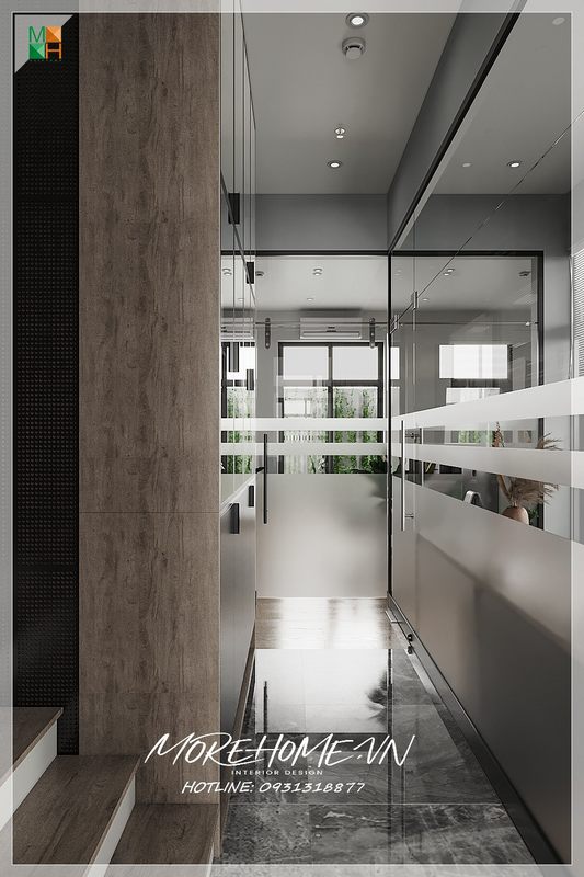 Thiết kế hành lang văn phòng làm việc sang trọng hiện đại gây được thiện cảm tốt với đối tác khi đến thăm.