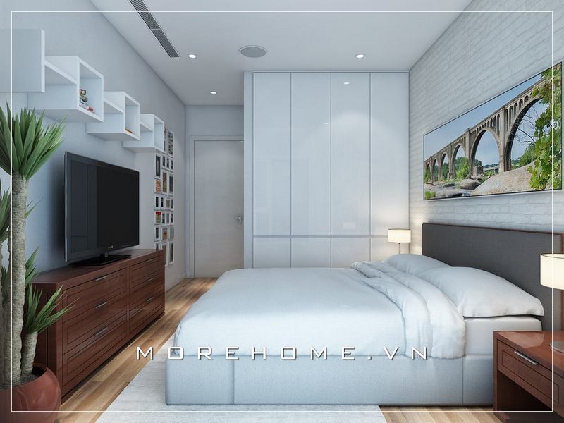 Giường ngủ chung cư phong cách hiện đại, khoảng vách đầu giường thiết kế kích thước lớn, gia chủ có thể dễ dàng ngồi tựa lưng thư giãn, đọc sách báo...