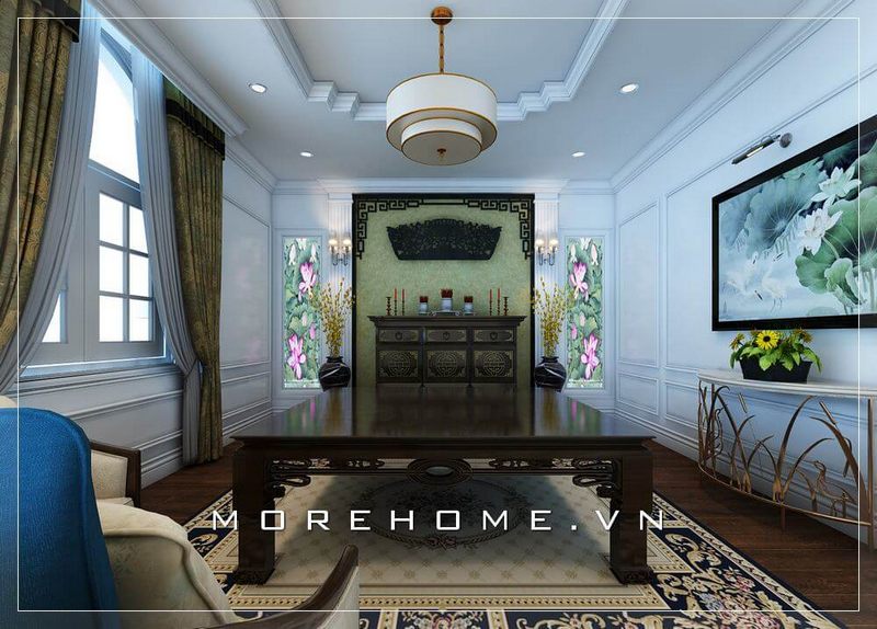 Trang trí phòng thờ biệt thự đẹp với nội thất gỗ tự nhiên cao cấp tông màu nâu đen sang trọng kết hợp bức tranh treo tường hoa sen độc đáo mang đến không gian phòng thờ thiêng liêng, cuốn hút mọi ánh nhìn