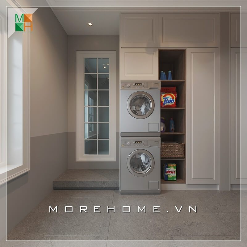 Trong không gian biệt thự được thiết kế theo phong cách hiện đại trẻ trung, dành riêng một không gian để giặt đồ tiện nghi với tủ chứa vuông vắn.
