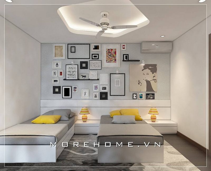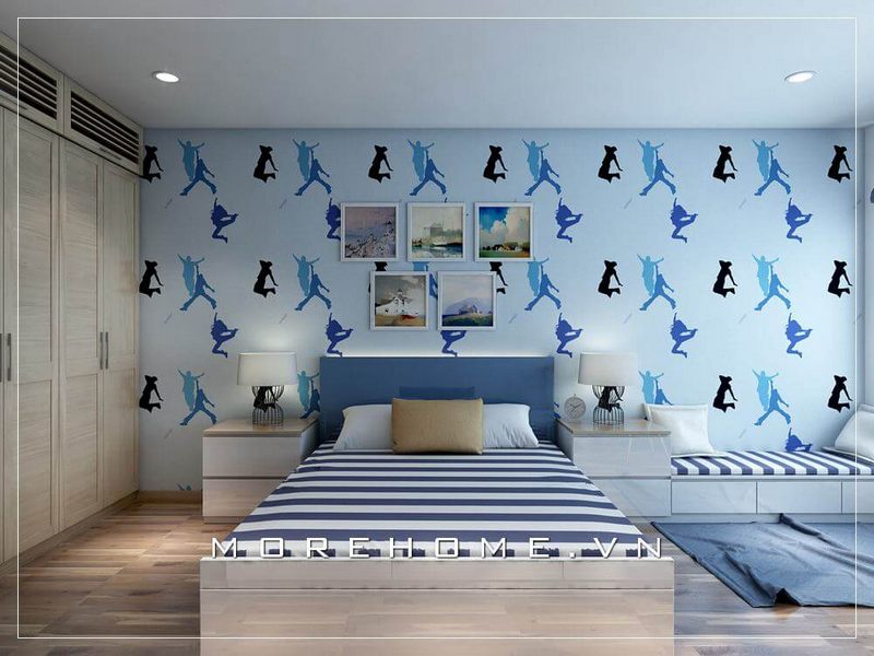 Nội thất phòng ngủ trẻ em phong cách hiện đại, đơn giản với học tiết giấy dán tường độc đáo tạo sự sinh động, thông thoáng và rộng rãi