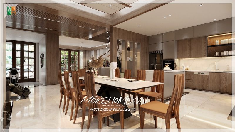 Bằng vẻ ngoài sáng bóng, không trơn, dễ vệ sinh đá lát nền màu sáng luôn là sự lựa chọn hàng đầu của các hộ gia đình. Với những ưu điểm nổi bật này, đá lát nền mang đến cho không gian bếp ăn cảm giác sạch sẽ thoáng mát khi bước chân vào căn phòng.
